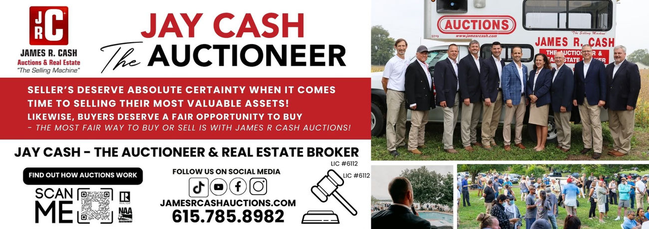 James R. Cash Auctions & Real Estate is a multi-state auction firm serving Middle Tennessee, Western Kentucky, and beyond. We conduct real estate, land, estate, and equipment auctions that bring serious buyers together to compete—delivering true market value with speed, transparency, and certainty.